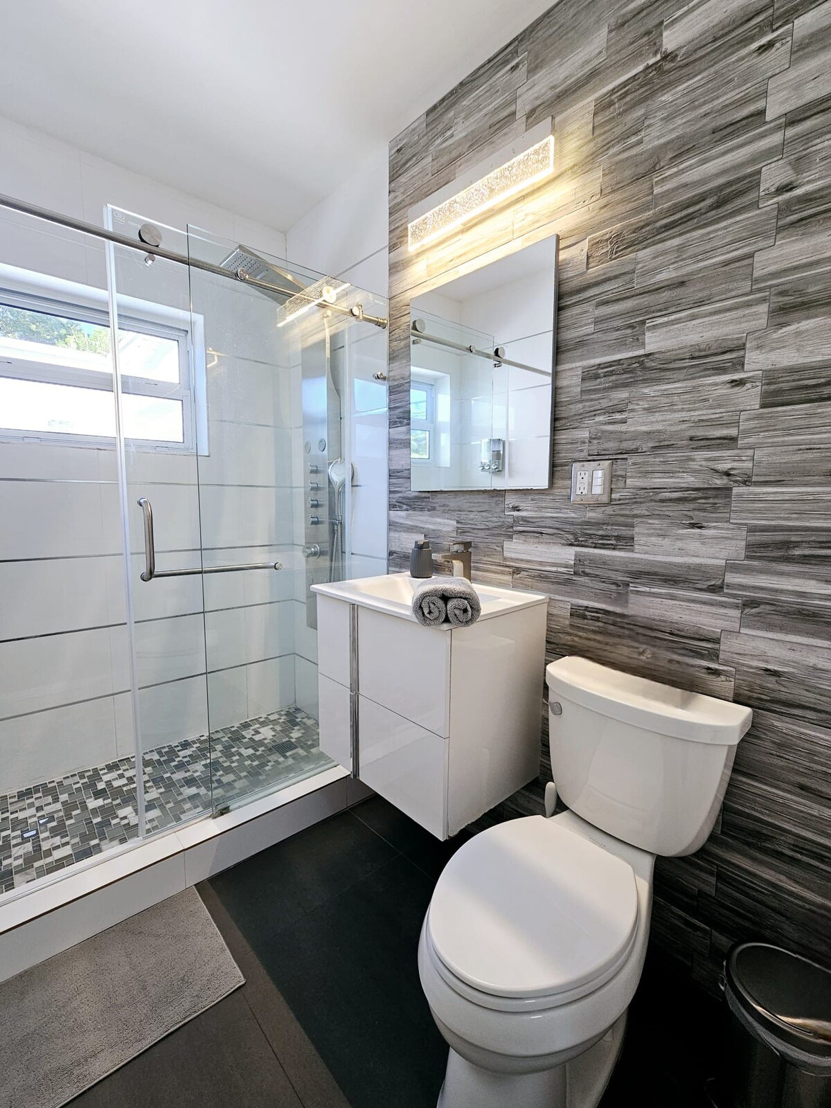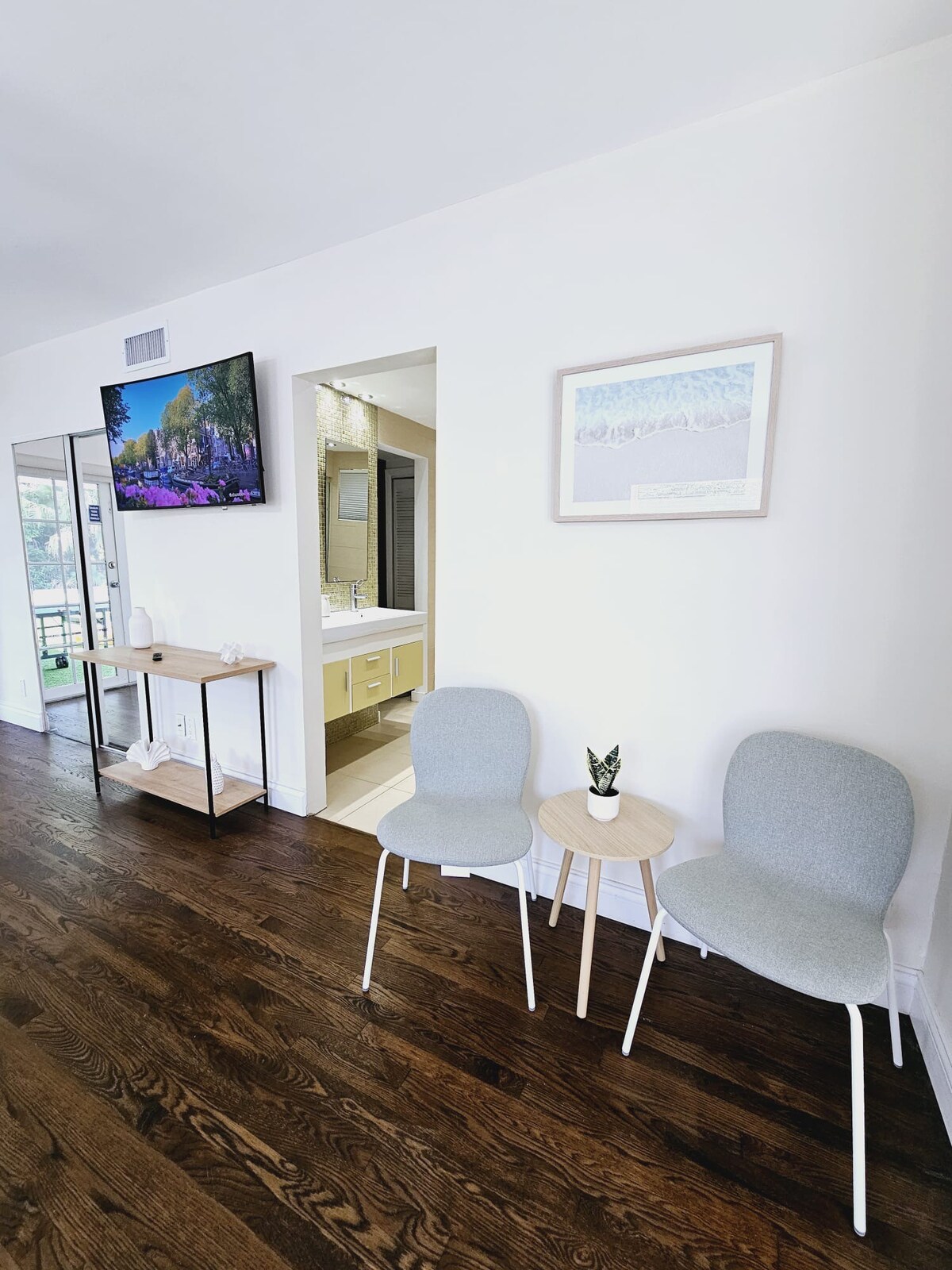 Outside, Brickell Enclave features a private backyard oasis, complete with a swimming pool, sun loungers, and a shaded seating area. Both bathrooms are outfitted with sleek, modern fixtures and large walk-in showers. The home also provides air conditioning throughout, laundry facilities, and a dedicated workspace, making it ideal for longer stays or business travelers.